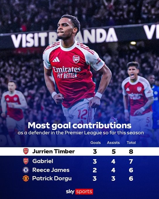 本赛季,廷伯在英超贡献3球5助攻,共参与8球,在英超后卫球员里排名第一,超过加布里埃尔(3球4助造7球)、里斯·詹姆斯(2球4助造6球)和多尔古(3球3助造6球)。